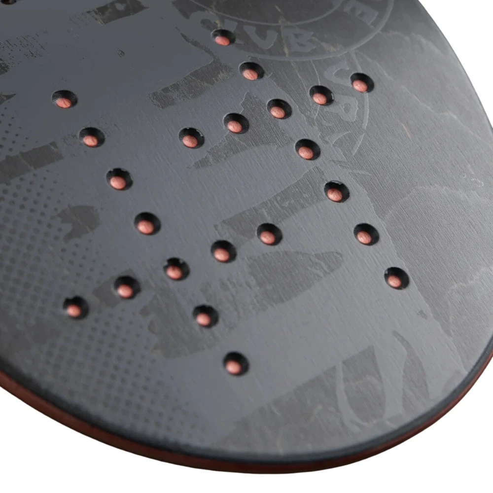 7 ply North American Maple pressed individually using epoxy – making a strong, responsive deck with long lasting pop and consistent concave and kick.