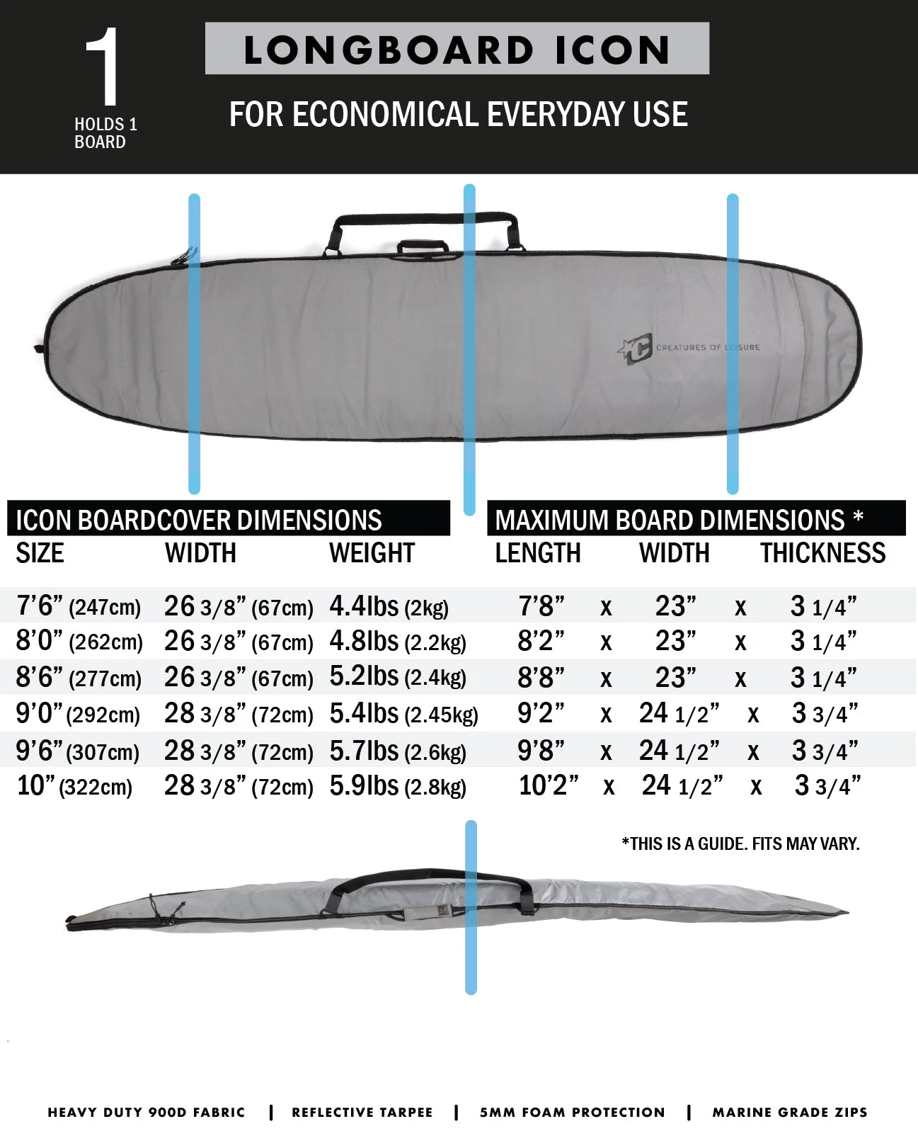 The Longboard Icon Boardcover is designed for economic day-to-day use. The single board capacity covers with fin slot are perfect for in-home storage or in-car transport to and from the beach.
