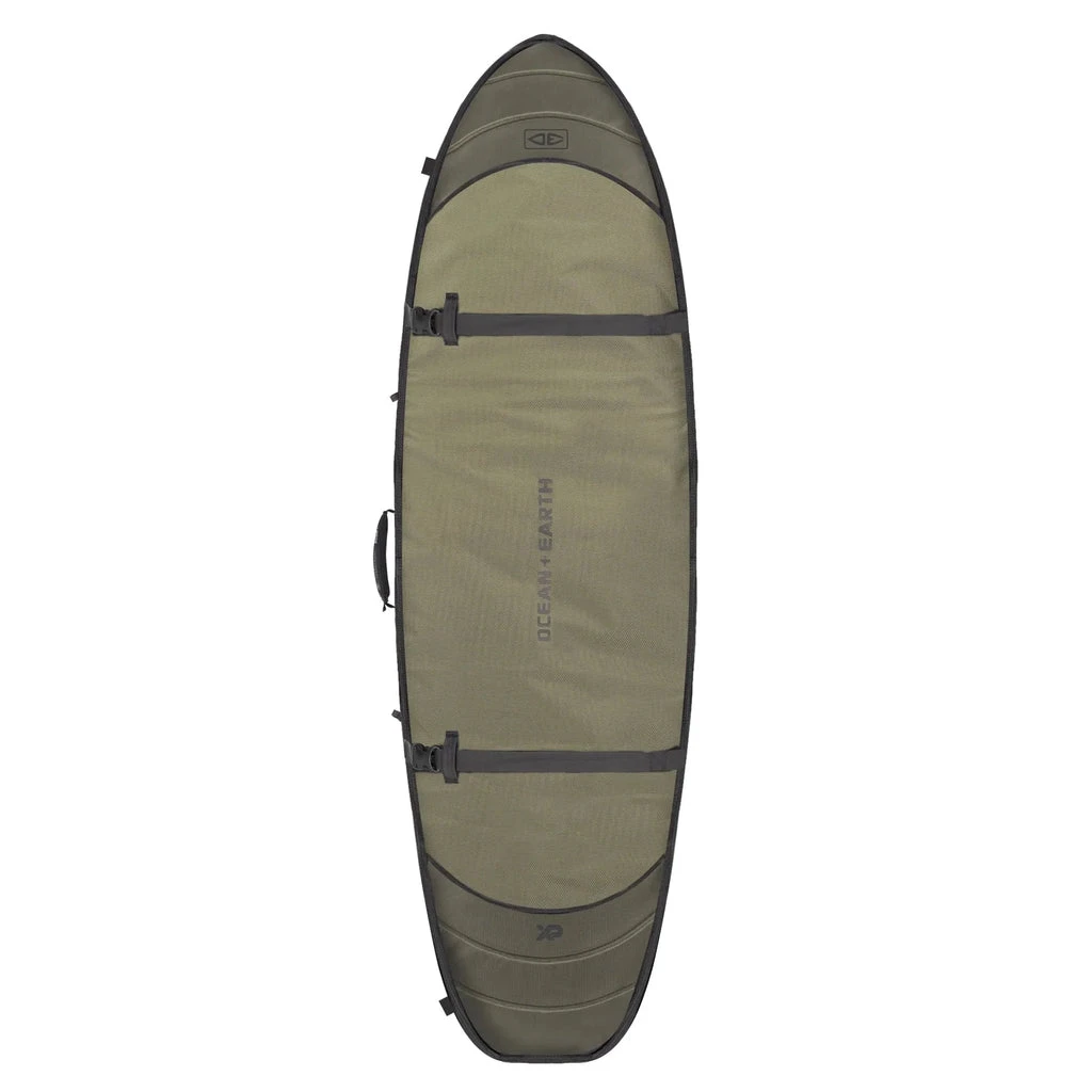 A wider fitting surfboard cover with custom wheels designed for carrying 3 fish and or short boards. This travel cover has shock-absorbing and anti impact foam, external compression straps and 20mm of protection on the rail, nose and tail.  Ideal for domestic or international surf trips.