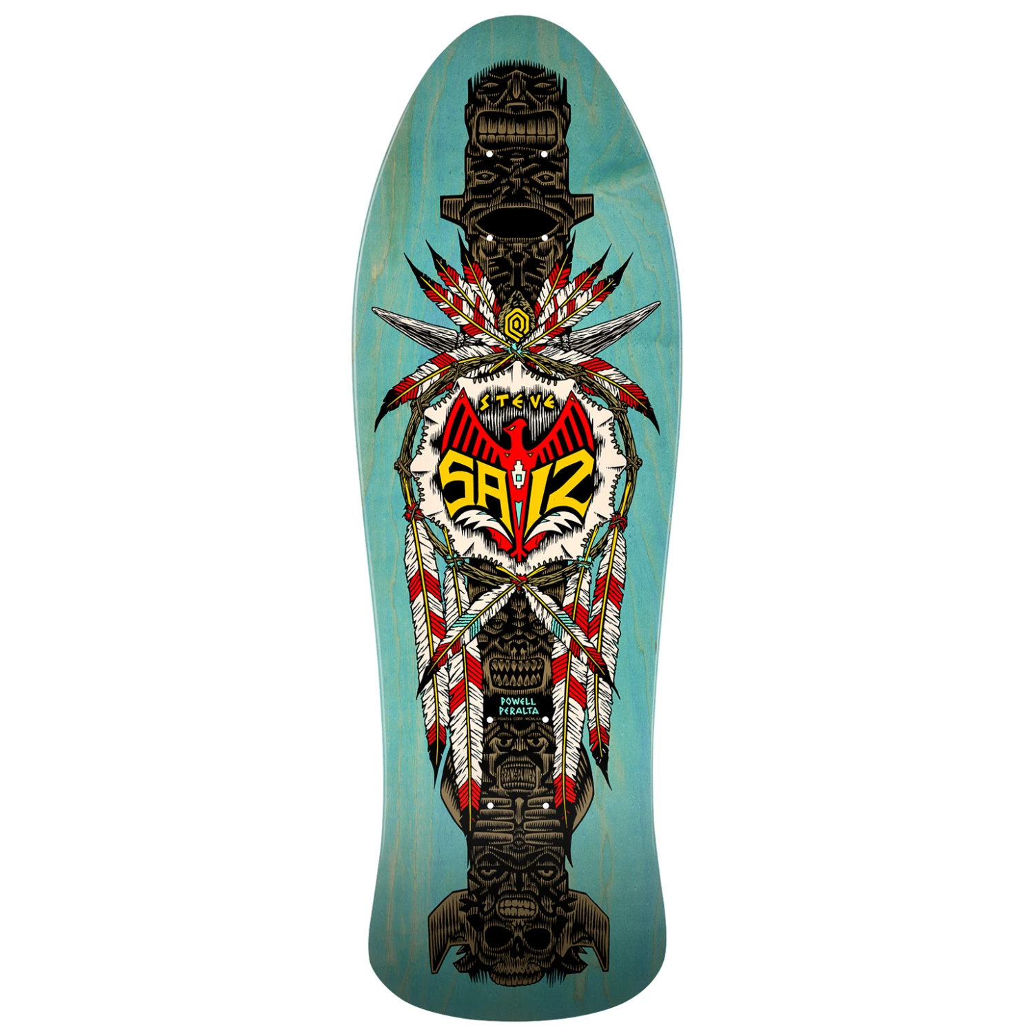 This Steve Saiz deck, originally released in 1989, was characterised by its blue-dyed top and rails. It featured the original concave and the “Long 4” truck hole pattern. Powell-Peralta’s re-issue decks are close reproductions of their 1980s counterparts, maintaining the original top and bottom graphics, shape, and concave.