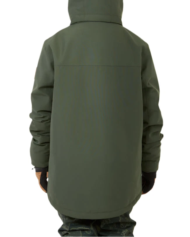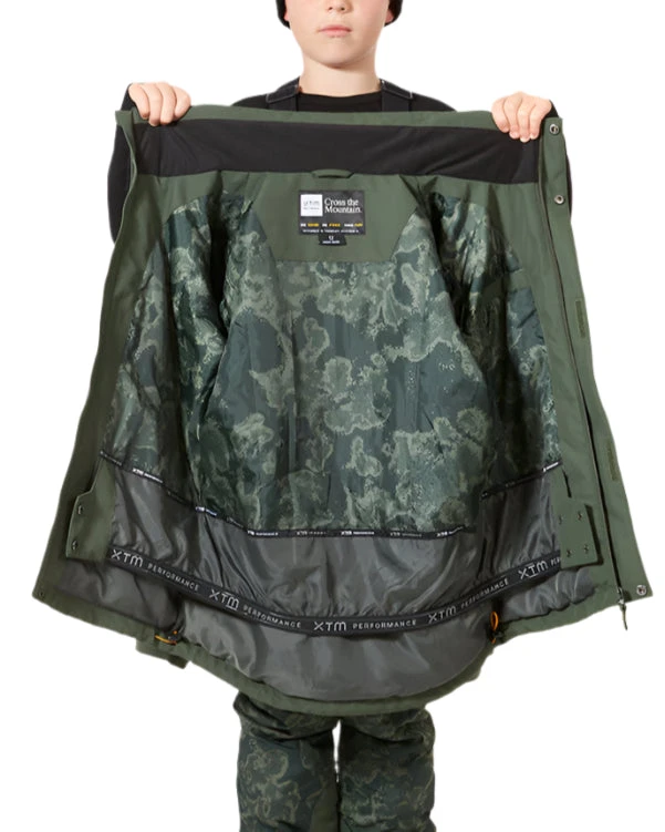 The Rumble Ski/Snowboard Jacket is made with a 100% recycled polyester stretch fabric and features a PFAS-free DWR finish for enhanced durability. It also includes a removable hood, fixed powder skirt, and various pockets for storage, making it the perfect choice for young skiers.